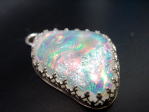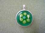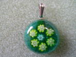 | 左の写真の銀枠に丸くカットした板ガラスとミルフィオリを置いて焼成したのが中央の作品です。銀枠は販売していますが、ご自身で作ることも可能です。右の作品はシルバーとは合わせずに銀の貼り付け金具をボンドで付けただけの作品です。涼しげな印象で夏向きです。好みによって作ってください。 | ||